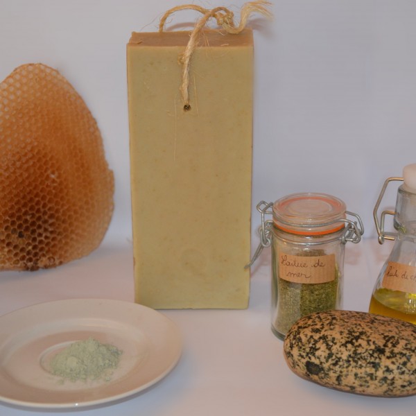 Savon à base de corps gras partiellement saponifiés (huile d'olive, de colza, de chanvre, de tournesol, de cire d'abeille), d'eau de source de Plouguiel, de miel, d'argile verte, d'algues (laitue de mer) et de glycérine issue de la saponification.
