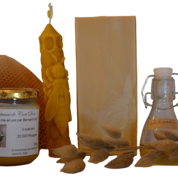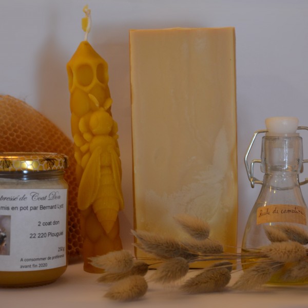 Savon à base de corps gras partiellement saponifiés (huile d'olive, de colza, de cameline, de tournesol, de cire d'abeille), d'eau de source de Plouguiel, de miel et de glycérine issue de la saponification.