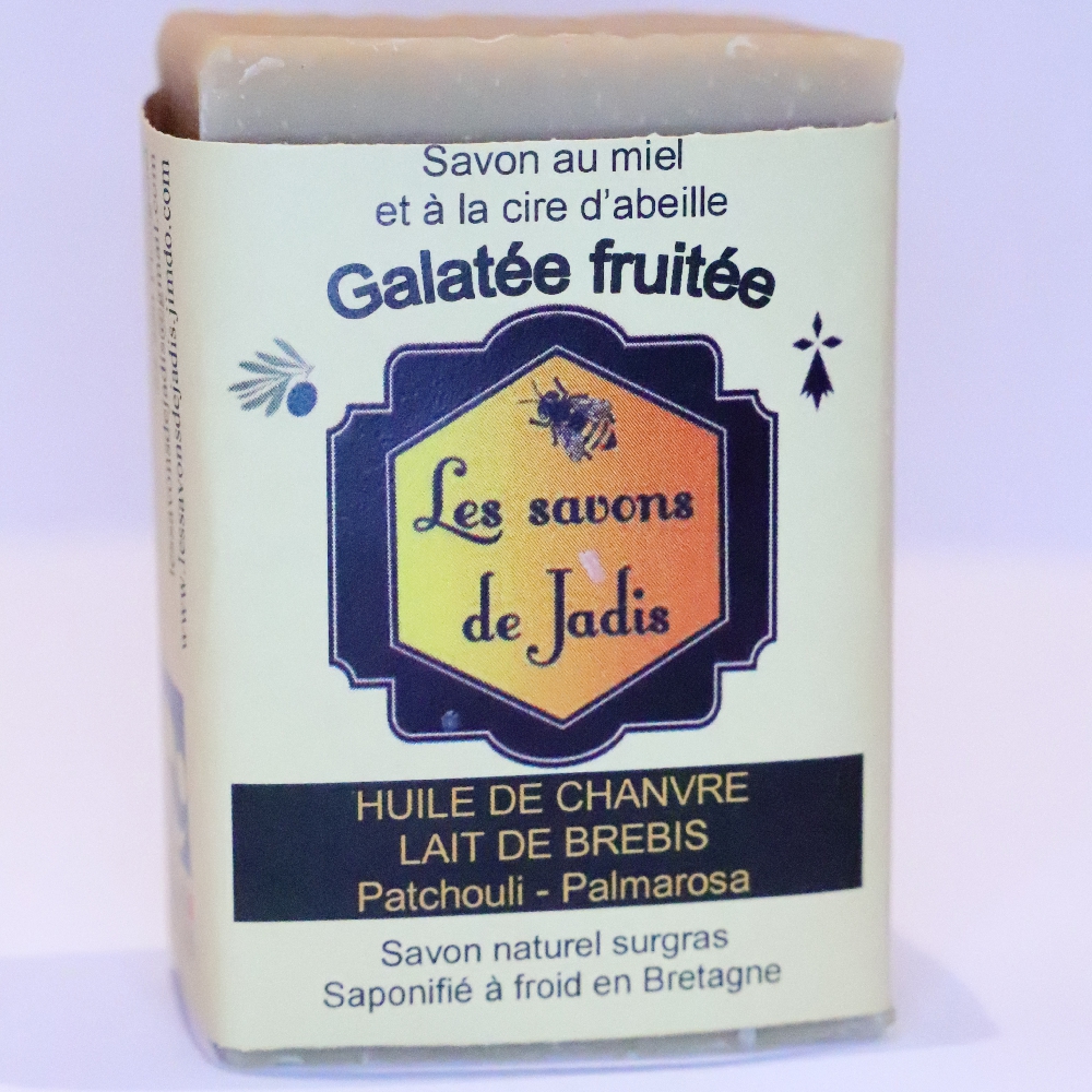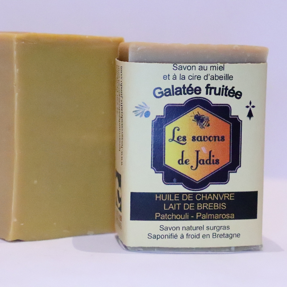 Savon à base de corps gras partiellement saponifiés (huile d'olive, de colza, de chanvre, de tournesol, de cire d'abeille), d'eau de source de Plouguiel, de lait de brebis, d'argile rose, de miel, de glycérine issue de la saponification et d'huiles essentielles (palmarosa, patchouli).